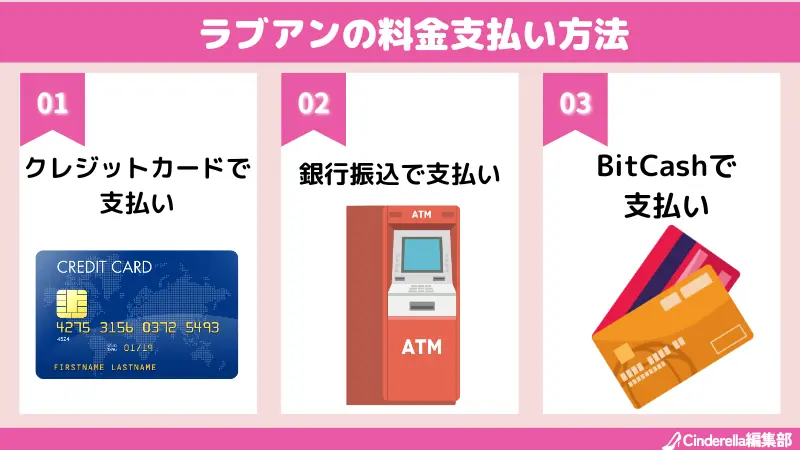 ラブアンの料金の支払い方法は、クレジットカード・銀行振込・BitCashです。